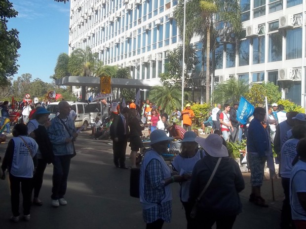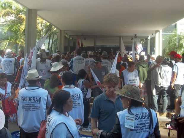 Servidores federais fazem protesto em frente ao Ministério do Planejamento (Foto: Weldson Medeiros/G1)A manifestação reúne servidores federais de todo o país e de diversas áreas do funcionalismo. Segundo o coordenador de administração e finanças da Federação dos Sindicatos dos Trabalhadores em Universidades Brasileiras (Fasubra), Rolando Rubens, entre as principais reivindicações do grupo estão aumento de benefícios, como auxílio creche e data-base, além de se posicionaram contra a privatização dos hospitais universitários.