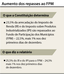 Atualmente, a Constituição estabelece para os municípios o percentual de 22,5% do imposto de renda e do IPI, além de 1% entregue nos dez primeiros dias de dezembro, totalizando 23,5% de repasse ao FPM. Com a proposta, o primeiro percentual sobe para 24,5%.