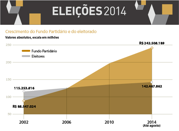 O orçamento do Fundo Partidário para as eleições de 2014 aumentou em 83% se comparado às eleições de 2010. Segundo dados do Tribunal Superior Eleitoral (TSE), em 2010, o total de recursos foi estimado em R$200 milhões. Já no pleito de 2014, os recursos acumulados até agosto somam 242 milhões; no entanto, estima-se que esse valor alcance a cifra de R$ 365milhões ao término das eleições.