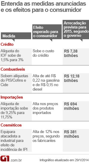 Entre as medidas que aumentam os impostos, o ministro Levy anunciou a alta no Imposto sobre Operações Financeiras (IOF) que incide sobre as operações de crédito para o consumidor. A alíquota passoude 1,5% para 3% ao ano (o equivalente à alta de 0,0041% para 0,0082% por dia).