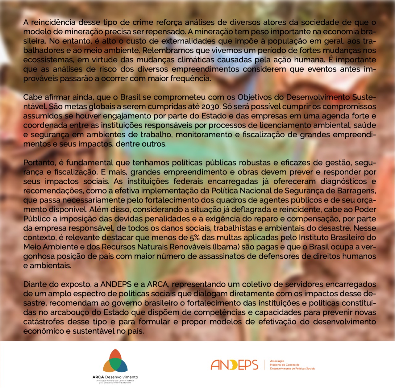 Diante do exposto, a ANDEPS e a ARCA, representando um coletivo de servidores encarregados de um amplo espectro de políticas sociais que dialogam diretamente com os impactos desse desastre, recomendam ao governo brasileiro o fortalecimento das instituições e políticas constituídas no arcabouço do Estado que dispõem de competências e capacidades para prevenir novas catástrofes desse tipo e para formular e propor modelos de efetivação do desenvolvimento econômico e sustentável no país.