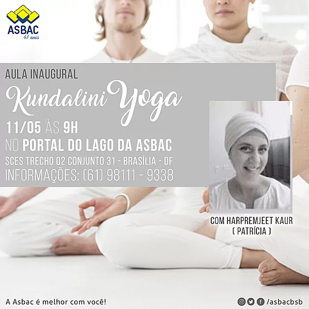 No próximo sábado (11), às 9h, ocorre no Portal do Lago da Asbac a aula inaugural de Kundalini Yoga com Harpremjeet Kaur Patrícia.