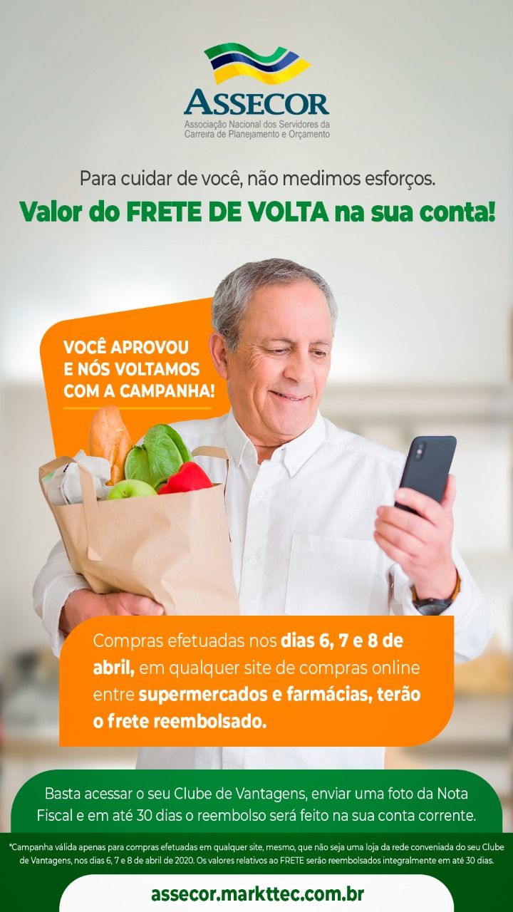 Nesse momento delicado, em que a orientação é ficar em casa por conta do risco de transmissão do Coronavírus (COVID-19), a Assecor tem + Vantagens disponibiliza aos seus filiados uma promoção que facilita no comprimento da medida. Compras efetuadas a partir de hoje (6), até quinta-feira (8), em qualquer site de compras online entre supermercados e farmácias, terão o frete reembolsado.