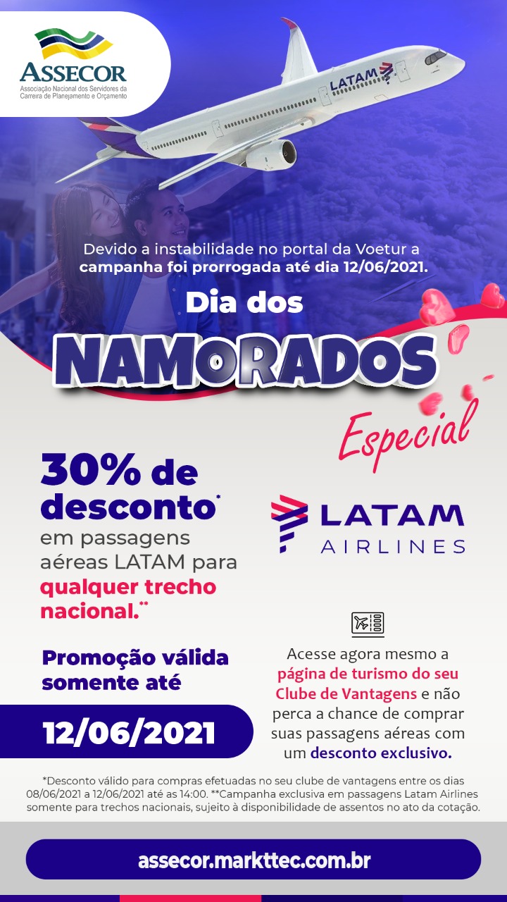 Planejando às férias para depois da pandemia? A Assecor Tem + Vantagens disponibiliza 30% de desconto em passagens aéreas LATAM para qualquer trecho nacional. A promoção é válida até 12/06 (sábado). Aproveite e não