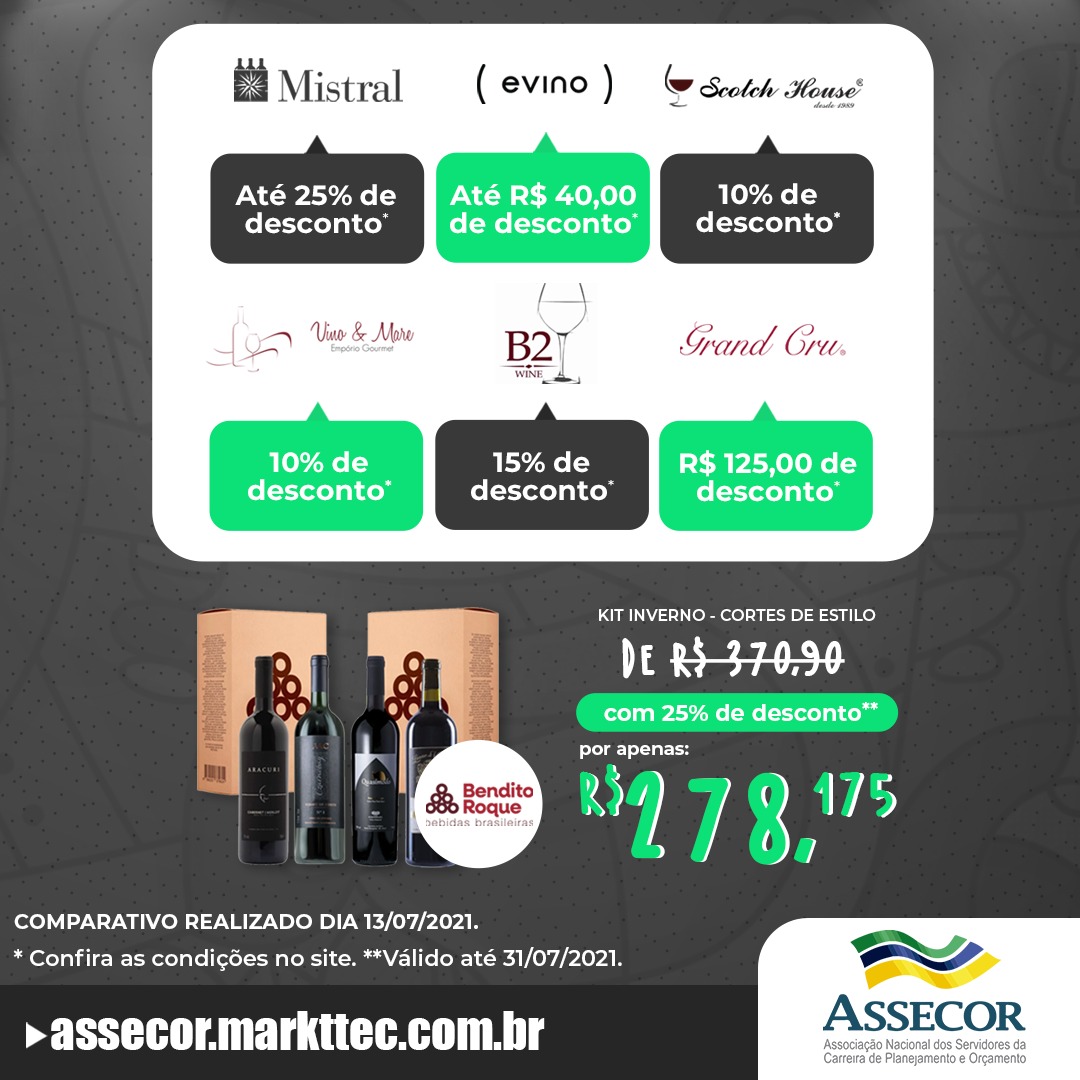 Que tal comprar seus vinhos com descontos exclusivos? E o melhor, sem sair de casa! Com o Assecor Tem + Vantagens você aproveita ofertas que chegam a 25%, além da economia em lojas do segmento que varia de R$ 40 a R$ 125. Selecionamos 5 lojas para você aproveitar.