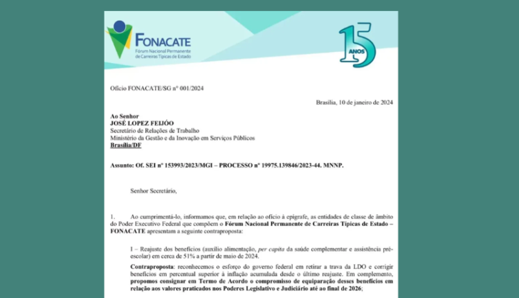 Recomposição Salarial: Fonacate propõe 9% em 2024, 7,5% em 2025 e 7,5% em 2026, e prazo para equiparação dos benefícios aos demais Poderes